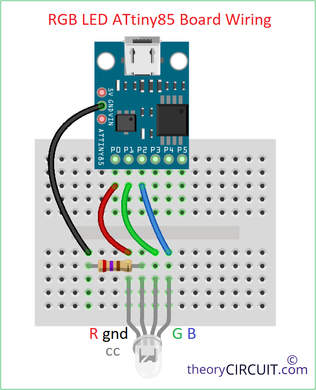 Here we driving each color pin of RGB LED using one GPIO pin from ATtiny85 and common pin is grounded through current limiting Resistor. By writing digital HIGH or LOW to PB0, PB1 and PB2, we can turn ON or OFF each color channel. Combining them gives different color output. Like Red + Green = Yellow, Green + Blue = Cyan, Red + Blue = Magenta and Red + Green + Blue = white. Make your own color by mixing these primary colors.