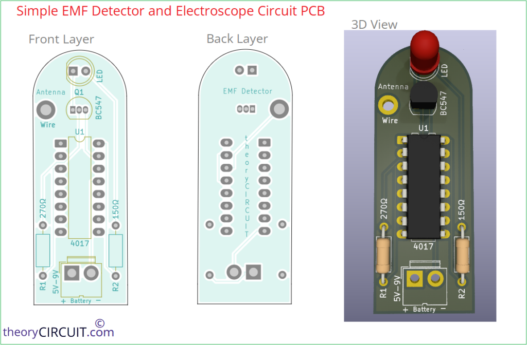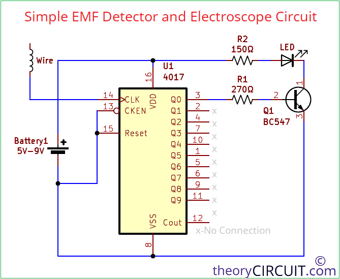 When ever I work with Transformers, Inductive circuit, I encounter a common problem, IS IT WORKING or NOT? I wonder if it’s possible to build a very simple Electromagnetic field (EMF) detector circuit using only few components (budget is my concern). After lot of browsing and searching I found numerous circuits again the same question rises will IT WORK? When I look into CD4017 CMOS decade counter based circuit, I thought to give a try. But that circuit requires little retouch hence that I came up with this simple EMF detector and electroscope circuit.