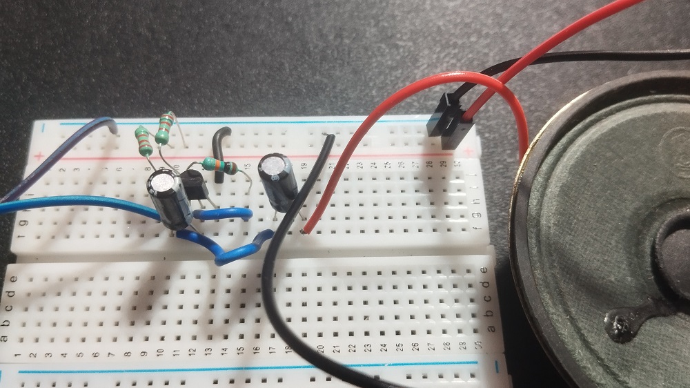 Thank you for providing this exercise! I am using this to learn the basics of sound amplification. I have built an Arduino project that uses an Mini DFPlayer (https://wiki.dfrobot.com/DFPlayer_Mini_SKU_DFR0299#Connection_Diagram). I have built your pre-amp version using SMD ceramic non-polarized caps (which I have on-hand), and found that the output is much lower than the output to an 8 ohm speaker connected directly to DFPlayer’s SPK_1, and SPK_2 . I have ordered polarized electrolytic caps, to see if that’s why the output is so low. While waiting for the caps, can you please explain which DFPlayer connections I need to use as “signal from mic”? I don’t really understand the reason the DFPlayer provides two outputs. But, I do know that when I connect both to the speaker, the direct sound is much louder than if I connect either SPK_1 & GND, or SPK_2 & GND.