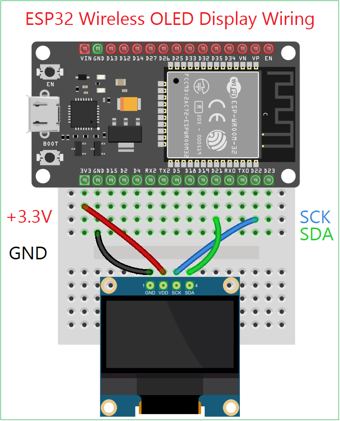This small idea turned into a very handy tool for IoT dashboards, tiny UI experiments and for fun message boards etc., 3.3V is enough to drive SSD1306 I2C OLED display, so just connect VDD of display to 3.3V in ESP32 board then GND to GND. Connect SDA pin to GPIO 21, SCL (SCK) pin to GPIO 22 that’s it we finished our wiring. (If you have problem with brightness or contrast of OLED display just add 4.7K pull up Resistors on SDA and SCL lines.)