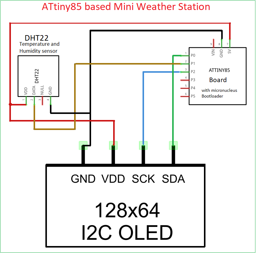 Just connect DHT22 sensor and SSD1306 OLED display with ATtiny85 board as shown in table,